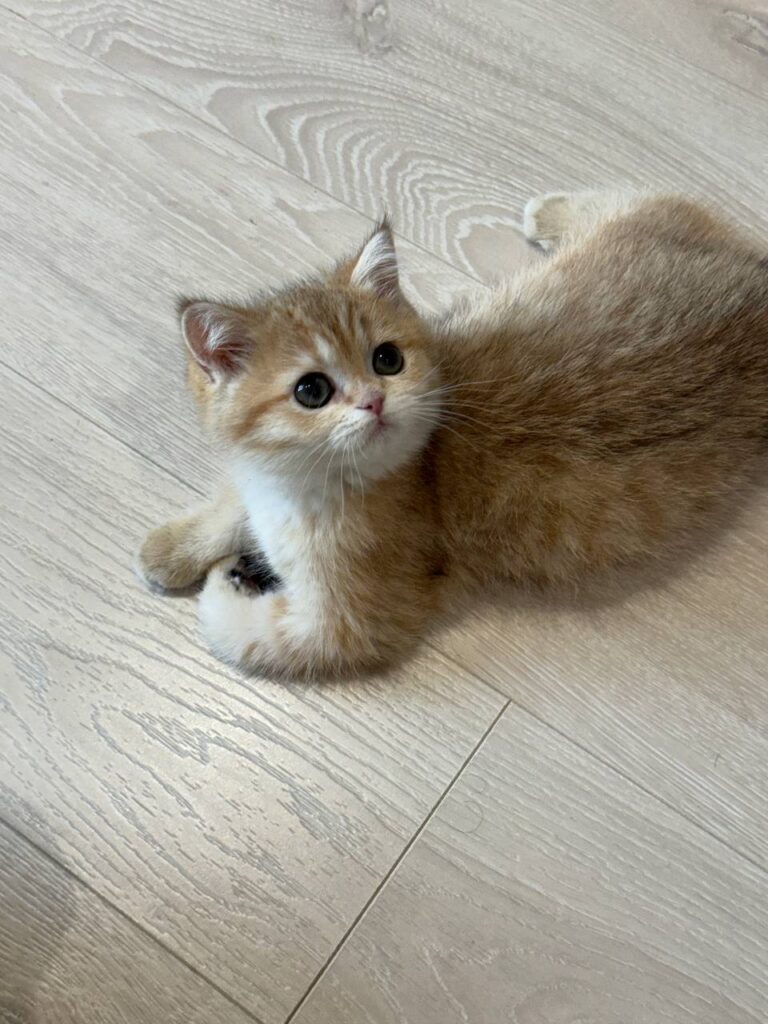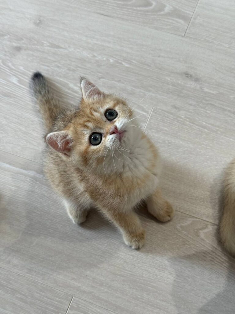 Meet Anna, an exquisite young female who perfectly embodies the grace and charm of the British Shorthair breed. At just two months old, Anna is already showing signs of the calm, affectionate, and easygoing temperament that makes the British Shorthair one of the most beloved feline companions in the world. With her striking “gold” coat, she is not just a pet but a living piece of art, boasting a warm, shimmering hue that sets her apart from more common coat colors.