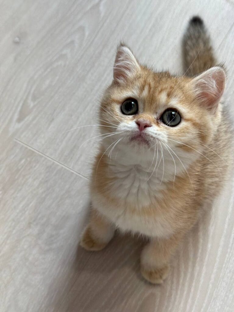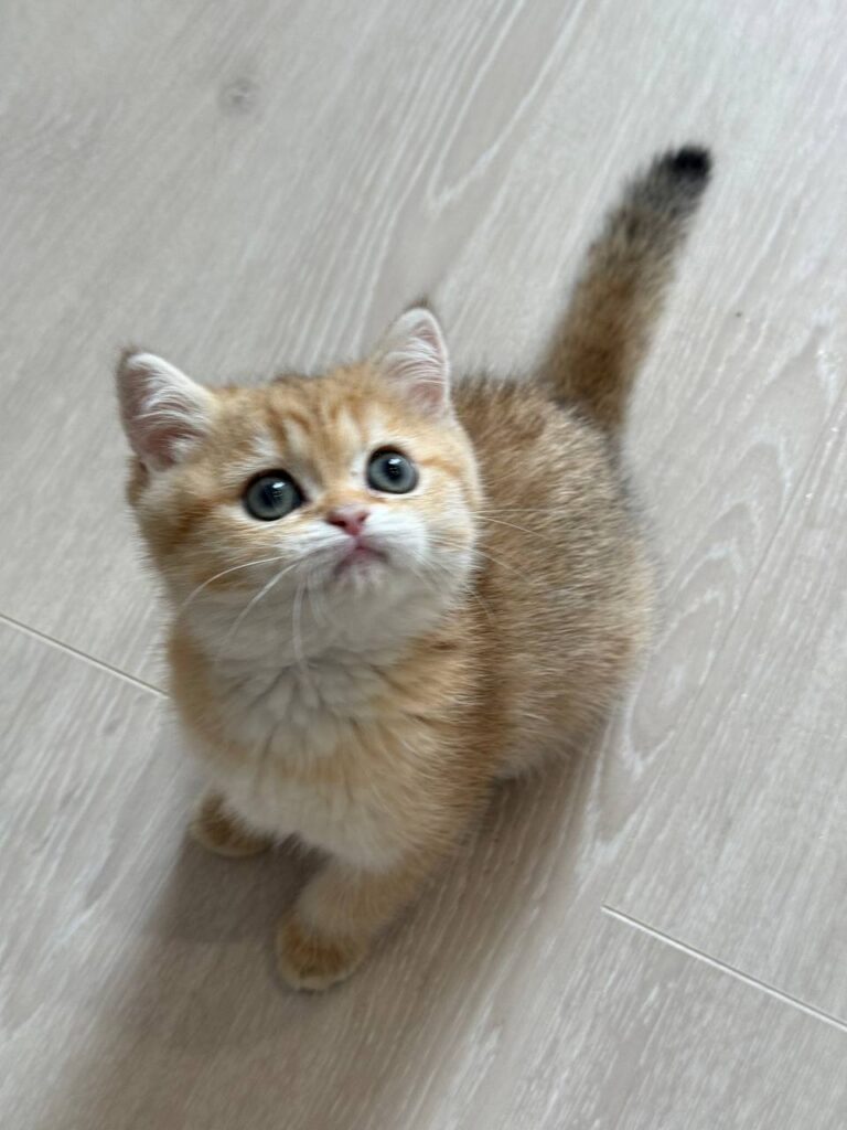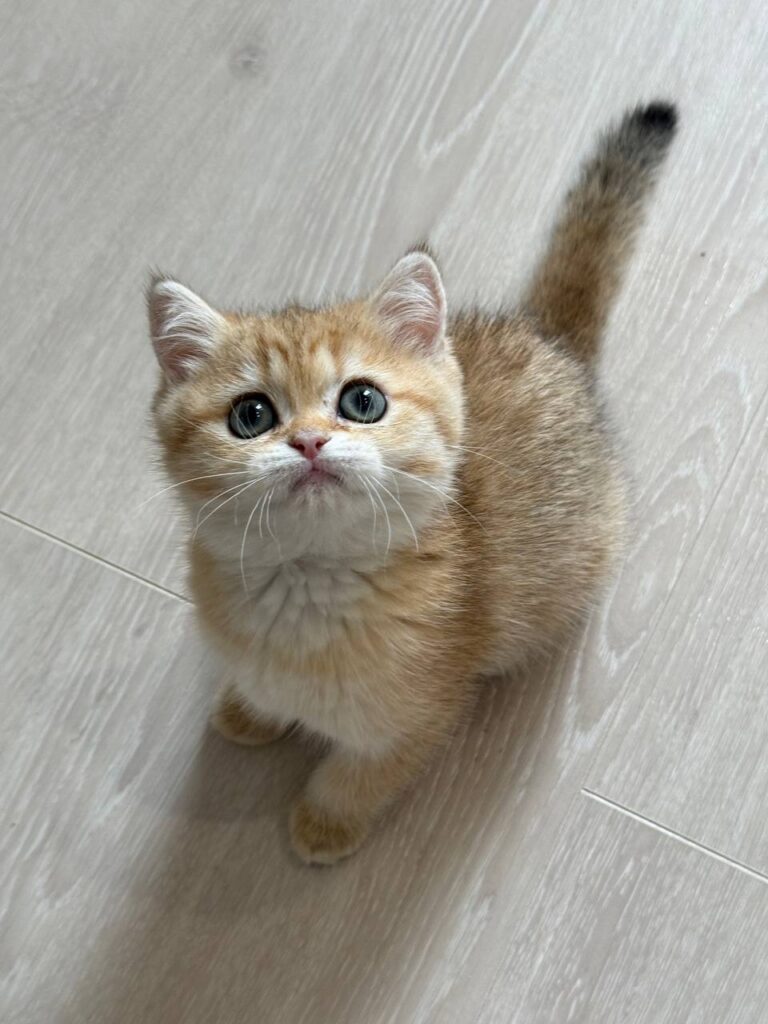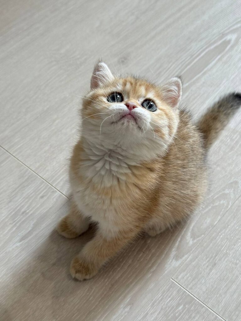 Ariel is an exquisite example of the British Shorthair breed, capturing hearts with her radiant personality and striking appearance. At just two months old, this young female kitten represents the pinnacle of feline grace and charm. The British Shorthair is widely renowned for its dense, plush coat and sturdy, rounded physique, often described as having “teddy bear” qualities. Ariel specifically boasts a rare and beautiful gold coat that glows with a warm luster, making her a truly standout individual within the British Shorthair community.