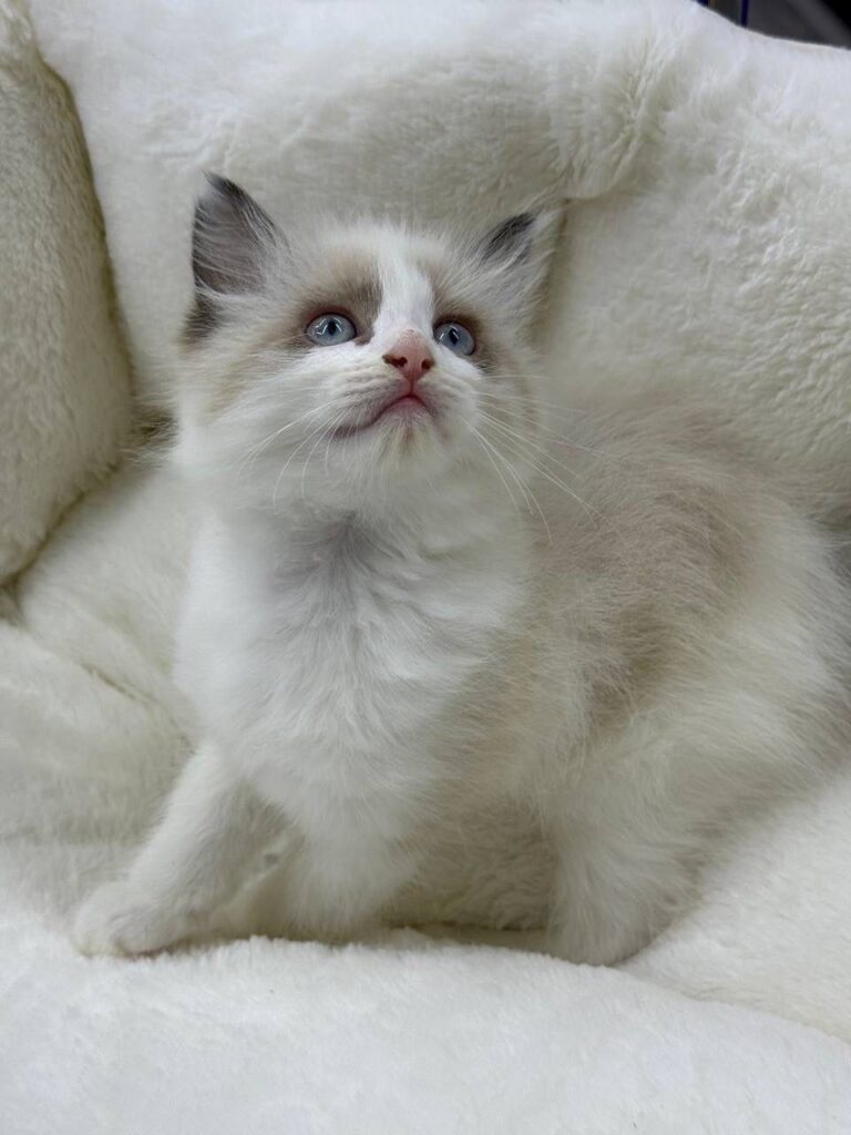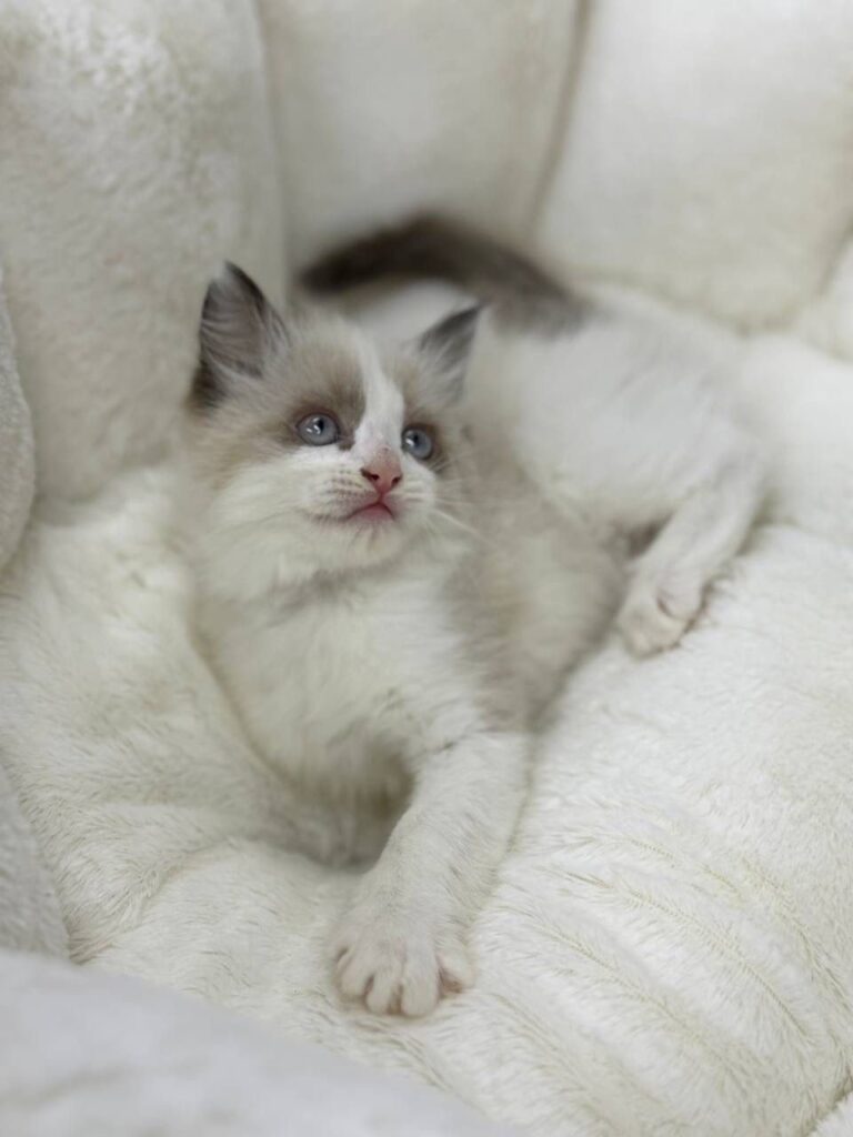 Meet Bruno, an absolutely charming young kitten who is currently looking for his forever home. Bruno is a male Ragdoll, and at just two months old, he is already capturing hearts with his striking features and gentle personality. The Ragdoll breed is world-renowned for its docile and affectionate temperament, often described as “puppy-like” because of the way they follow their human companions from room to room. Bruno is a perfect example of these traits, showing early signs of the calm and loving nature that makes the Ragdoll such a sought-after companion.