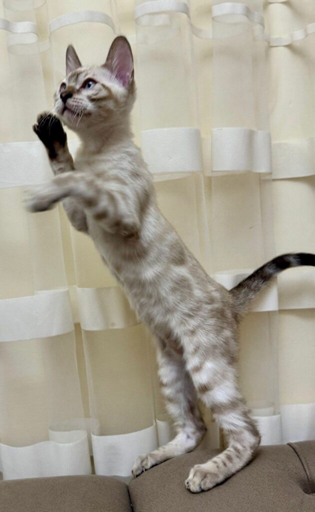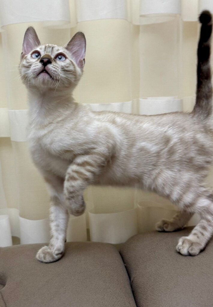 This incredibly cute kitten with the striking blue eyes and light, spotted coat is a Bengal in a ‘snow’ (specifically, seal lynx point) coloration, perfectly suited for the name Buddy. The Bengal breed originated from the crossing of domestic cats with the Asian Leopard Cat, aiming to bring the beauty of a small wild cat into a domesticated companion, resulting in the energetic and intelligent pet you see today. Buddy, as a young Bengal kitten, is an active and curious little creature whose stunning pattern and color will only deepen and develop as he matures. His short, soft pelt is one of the hallmarks of the Bengal breed.