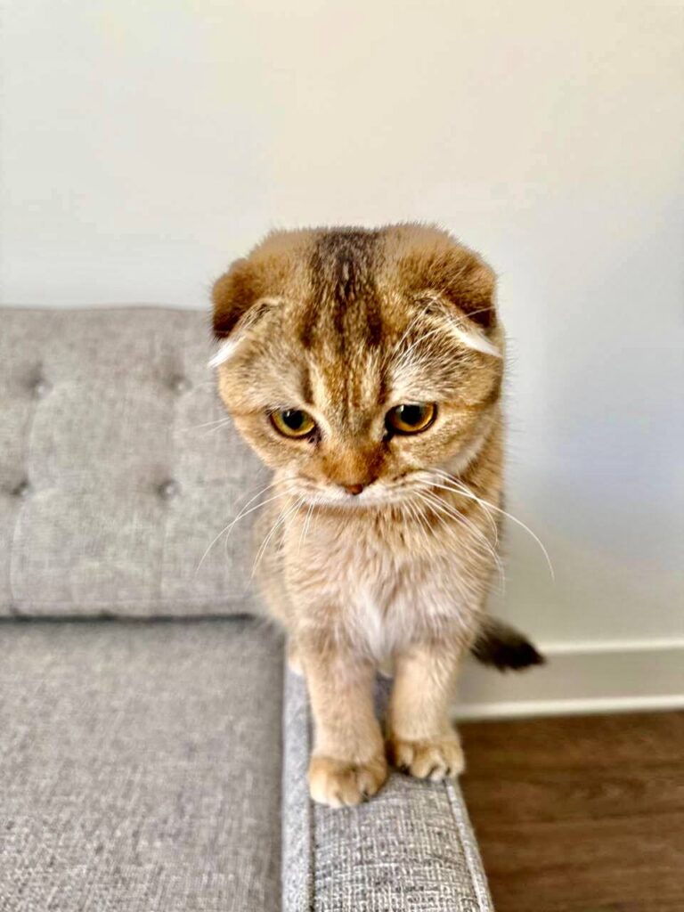 In terms of care, Scottish Fold cats have some specific needs. Because the folded ears are the result of a cartilage mutation, owners must be mindful of their overall joint health. Responsible breeders screen for genetic issues, but it’s still important to monitor for signs of stiffness or discomfort as the cat grows. Grooming for short-haired Scottish Fold cats like this kitten is relatively simple—weekly brushing is usually enough to keep the coat soft and shiny.