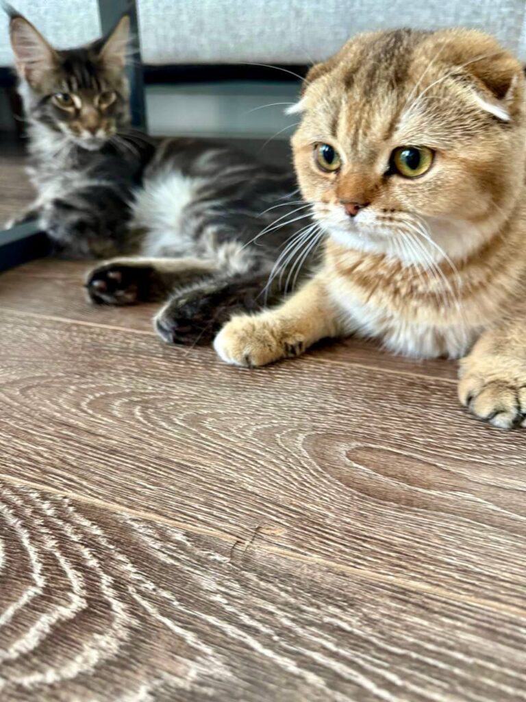 This kitten also shares a space with the Maine Coon in the background, which suggests they might be growing up together. The calm demeanor of the Scottish Fold means they often get along well with other cats, dogs, and even children. They enjoy companionship and don’t like to be left alone for long periods. While they may appear calm, they often form deep bonds with their human families and like to be involved in daily activities—whether that’s curling up next to you while you work, following you from room to room, or sitting nearby during mealtimes.