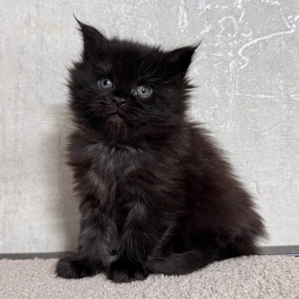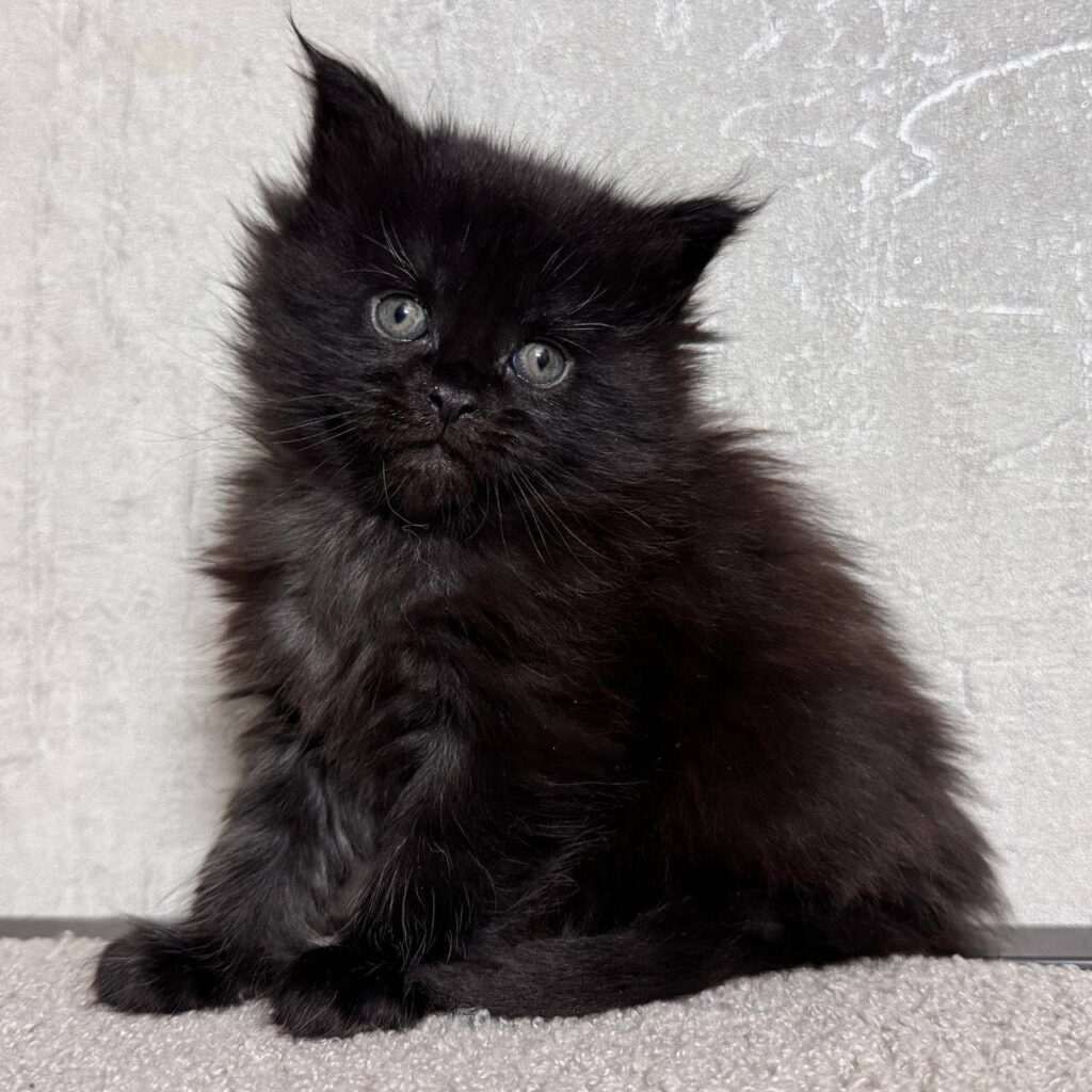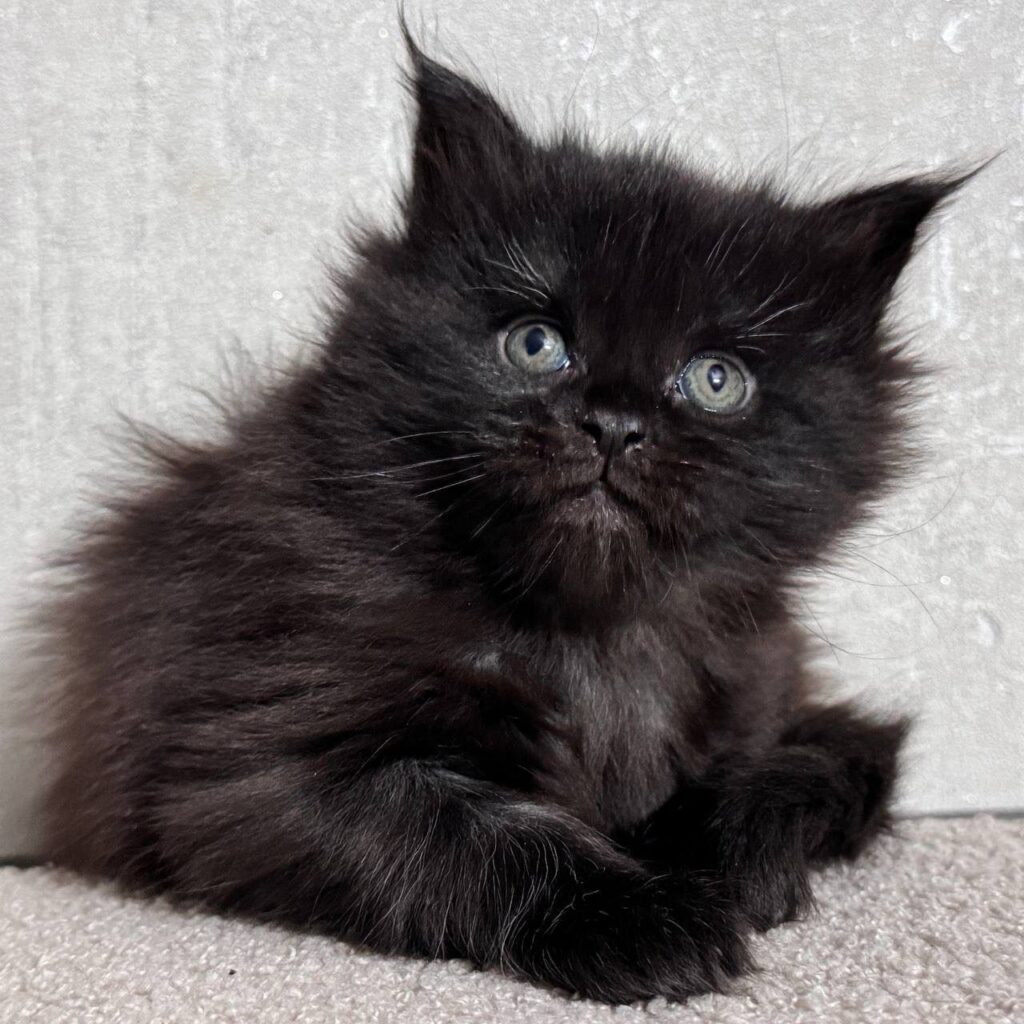 Meet Mila, an exquisite young female who perfectly embodies the grace and charm of the Maine Coon breed. At just one month old, this tiny black beauty is already beginning to display the majestic characteristics that make the Maine Coon one of the most sought-after feline companions in the world. With her sleek, midnight-black coat and her developing tufted ears, Mila is a stunning example of how striking a solid-colored Maine Coon can truly be.