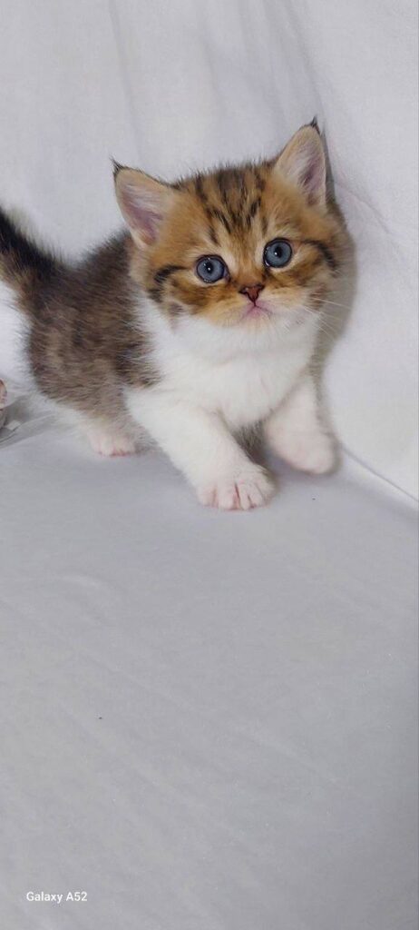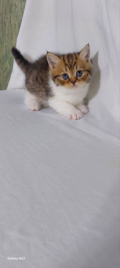 Meet Shadow, an exquisite young kitten who perfectly embodies the charm and grace of the British Shorthair breed. At just 1.5 months old, this little male is already showing the distinctive physical traits and temperament that make the British Shorthair one of the most sought-after feline companions in the world. With his striking bicolor coat, Shadow is a visual delight, combining the classic, sturdy build of his lineage with a playful, youthful energy that is sure to bring joy to any household.