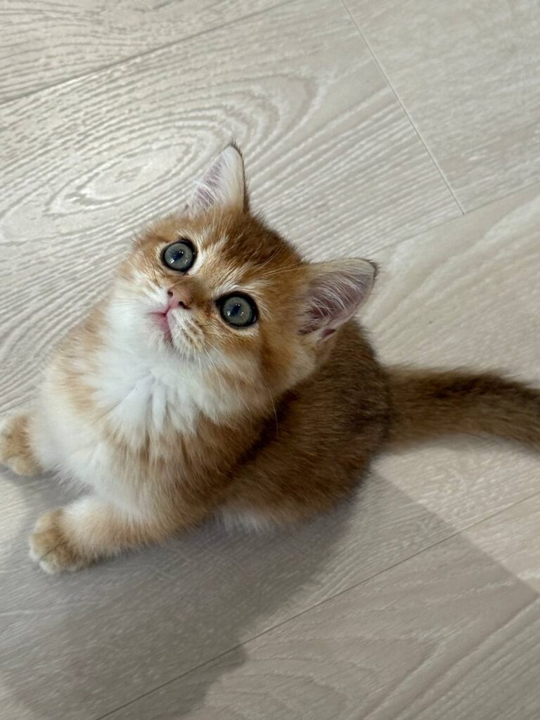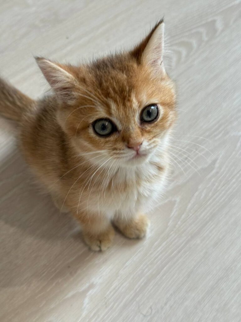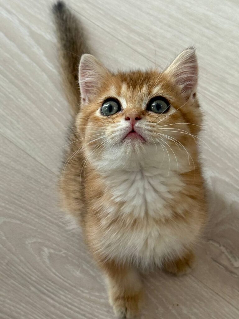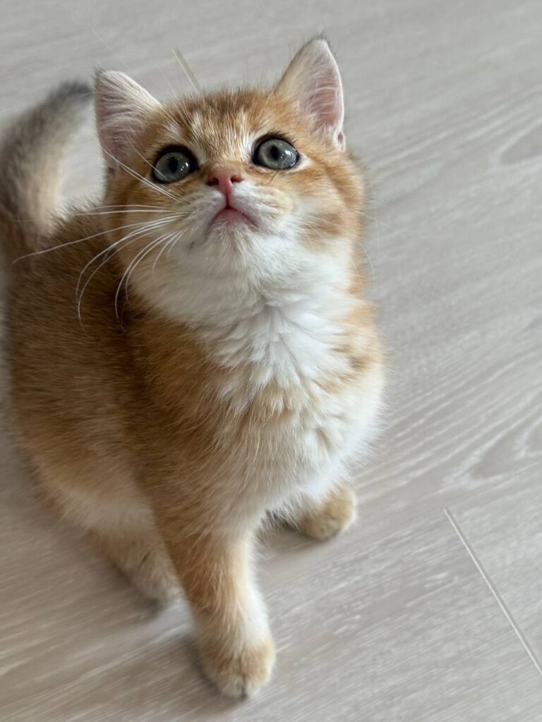 The British Shorthair is one of the most beloved and recognizable cat breeds in the world, often referred to as the “teddy bear” of the feline kingdom. Toby embodies this description perfectly. At just two months old, he already possesses the signature dense, plush fur that makes the British Shorthair so irresistible to pet. His unique golden coloring sets him apart from the traditional blue or grey variants, giving him a warm, sun-kissed appearance that glows in the light. As he matures, his sturdy frame and round features will only become more prominent, showcasing the classic, dignified silhouette the breed is known for.